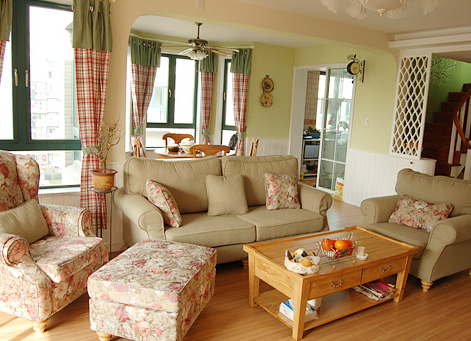 2010-2-10客廳與餐廳之間設計了拱門(mén),客廳宜家的沙發(fā)+花花的布衣沙發(fā),窗簾是格子布,墻壁顏色是豆綠色的!具有濃郁的田園風(fēng)情!...[繼續閱讀] -